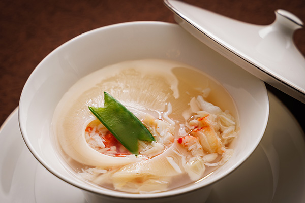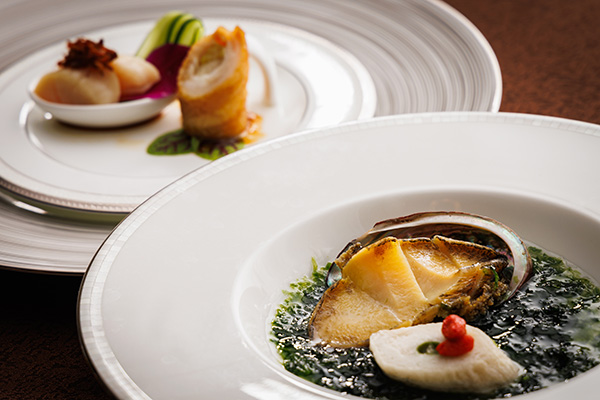 | お料理 | ・前菜盛り合わせ(帆立貝XO醤のマリネ/アスパラの豚肉巻き 蜂蜜ソース/クラゲ玉子巻き/棒々鶏/季節野菜の寒天寄せ)) ・ふかひれ姿煮とタラバ蟹肉入り澄ましスープ ・海老チリソース煮とマヨネーズソース炒め ・北京ダックと鰻のライスペーパー巻き揚げ ・蝦夷鮑と絹笠茸蒸し 翡翠ソース ・和牛と黒胡椒炒め バーベキューソースと共に ・魚介入り炒飯スフレ仕立て ・デザート盛り合わせ |