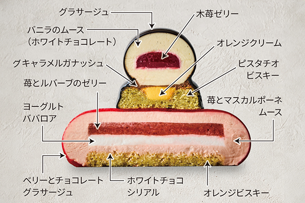 「Suicaのペンギンがクラッカーを持って、サンタクロースの袋から飛び出してくる」、そんなクリスマスをイメージした光景をケーキで表現しました。Suicaのペンギン部分は木苺ゼリー入りのバニラムースとオレンジクリーム入りのピスタチオビスキーが織りなす、甘味と酸味のバランスがとれた味わいです。艶やかな光沢が美しい下層部分は、苺とルバーブのゼリーとヨーグルトのババロア、オレンジのビスキーを苺とマスカルポーネムースで包み、甘酸っぱいベリーとチョコレートのグラサージュでコーティングしました。鮮やかなグリーンが映える濃厚なピスタチオクリームとともにご堪能ください。