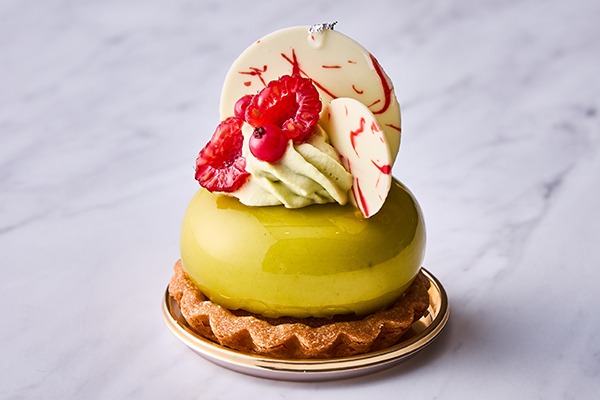 鮮やかな緑色の艶感が目を引く、イタリア産のピスタチオムースの中に酸味の効いたフランボワーズのゼリーと、果実入りババロアが入った酸味と甘みのバランスが絶妙なケーキです。