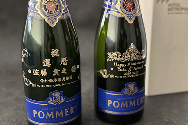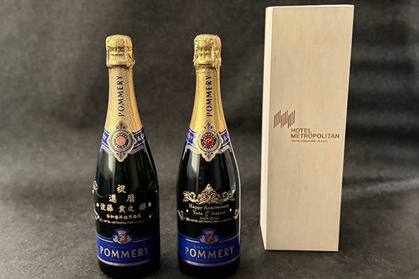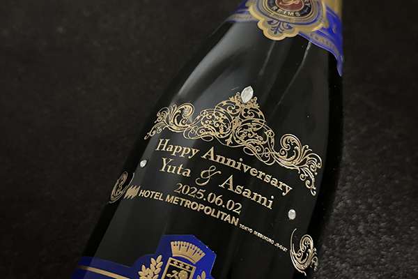 シャンパンのラベルにお名前やメッセージを彫刻いたします。印刷と違い、ボトルに高級感を演出できる彫刻ボトルです。ご家族の長寿のお祝いや結婚記念日、お世話になっている恩人へ感謝の気持ちをお伝えする贈答用としてぜひご利用ください。