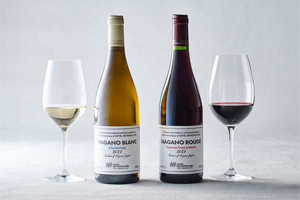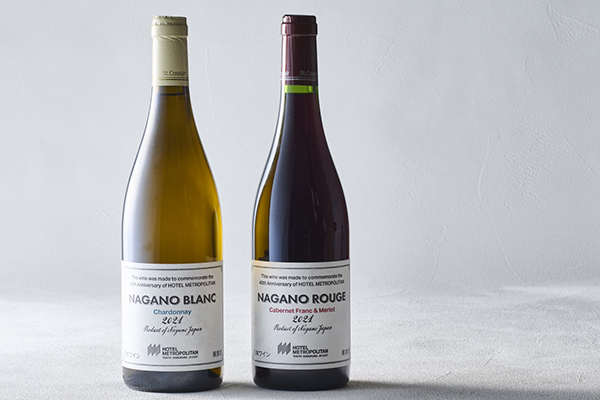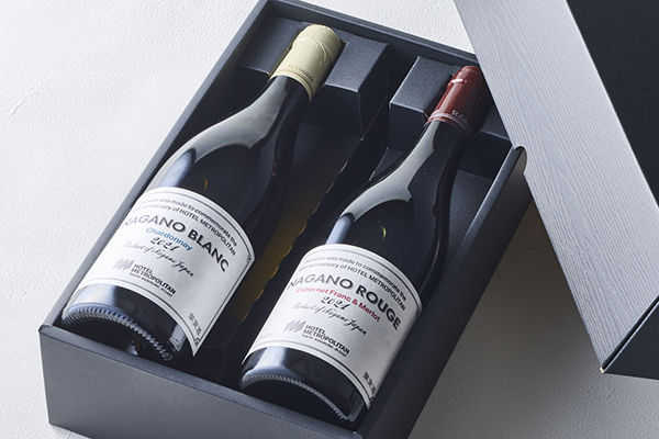 開業を記念して、ホテルオリジナルデザインのラベルが施されたワインボトルを販売いたします。長野県産の赤ワイン用ぶどう品種“カベルネ・フラン”と“メルロー”を主体とした「長野ルージュ」は、口当たりまろやかで熟した果実の風味が広がり、上品な酸味とほどよい渋みをお楽しみいただけます。白ワイン用ぶどう品種“シャルドネ”を100%使用した「長野ブラン」は、熟した洋ナシや白い花のような甘い香りと柔らかいオークの香りが立ち上り、心地よい果実の余韻をご堪能いただけます。大切な方への贈り物や、自分のための特別な1本としてご利用ください。