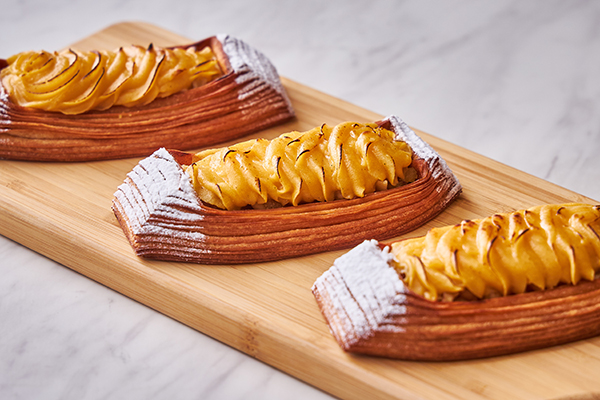 爽やかな味わいのクリームチーズカスタードに、ほくほくとした角切りのさつま芋をのせ、しっとりとしたコクと甘みのあるスイートポテトを絞り、焼き上げました。