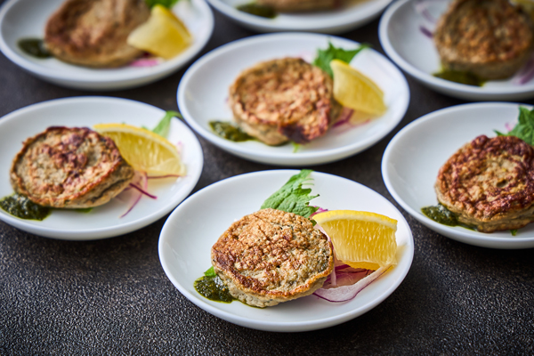 フランス北東部の伝統的な郷土料理「キッシュ・ロレーヌ」は、サクッとした香ばしい生地と、口の中でとろけるようなやわらかな卵のアパレイユが絶品です。素材の旨みが凝縮されたこの一品は、福島県玉川村の玉ねぎを甘みが出るまで炒め、ほうれん草とともに焼き上げました。2品目は、赤身の芳醇な旨みと、とろけるような甘い脂が特徴のブランド豚「白河高原清流豚」を使用した「低温調理ロースト」です。じっくりと火を通すことで、しっとりとした極上の食感をお楽しみいただけます。付け合わせには、甘さが際立つ福島県産春キャベツのなめらかで濃厚なクリームスープを添え、お肉の旨みを一層引き立てます。3品目は、ディナー限定の郷土料理「ポーポー焼き」をモダンにアレンジした一皿です。秋刀魚を丁寧にミンチにしてハンバーグ状に焼き上げ、香ばしく仕上げました。シェフ特製の大葉ジェノベーゼソースは、大葉の爽やかな香りと和の風味に、チーズのコクを融合させた独創的な味わいです。新感覚の美味しさをご堪能ください。