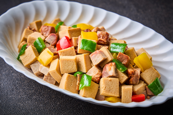 【中国料理】福島県会津地方の郷土食材「凍み豆腐」と広東風チャーシューを組み合わせた「会津凍み豆腐と叉焼の和え物」をぜひご賞味ください。チャーシューの旨みをしっかりと吸収した凍み豆腐は、ご飯にもお酒にもぴったりの一品です。