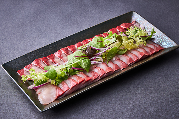 西洋料理からは、冬場に脂が乗って旨みが増す高級魚「石川県産寒鰤」を使ったカルパッチョをご賞味ください。赤と白のコントラストが美しく華やかな一皿で、スモークソルトとオリーブオイルが寒鰤の濃厚な旨みを引き立てます。また、福井県を代表するソウルフード「ボルガライス」もお楽しみいただけます。ふんわりオムライスの上にカリッと揚げたトンカツを乗せ、奥深い味わいのシェフ特製「ビーフストロガノフ」をたっぷりとかけてお召し上がりください。ひと口ごとに、さまざまな食感と味わいが広がる満足感あふれる一品です。