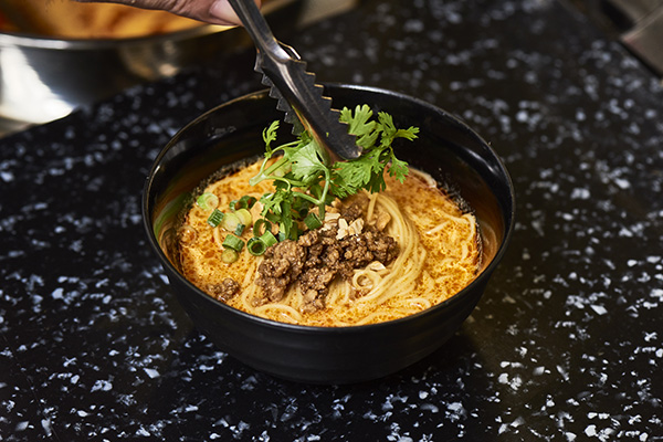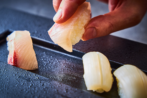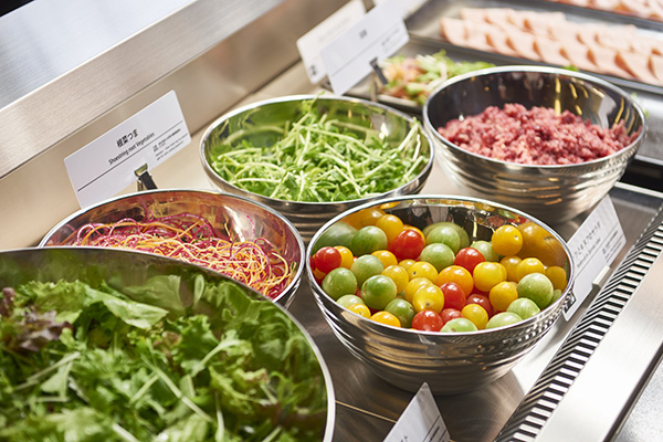 日本料理「花むさし」や四季彩茶寮「旬香」からの前菜や小鉢も含めたお料理をはじめ、揚げたての天麩羅や貝をふんだんに使用した特製“海鮮貝だし汁”で食べる野菜や仔羊のしゃぶしゃぶなど、スタッフがその場で調理パフォーマンスを繰り広げます。ランチタイムには本日の焼き魚やそば・うどん、日替わりでねぎとろ丼やちらし寿司などを食べやすいサイズにした“クロス小どんぶり”をご用意しました。またディナータイムには握り寿司などが登場します。