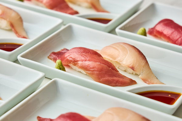深い赤色の身と、ふくよかな味わいと口の中でほどけるような舌触りの「本鮪」と白身魚を握り寿司でご賞味ください。