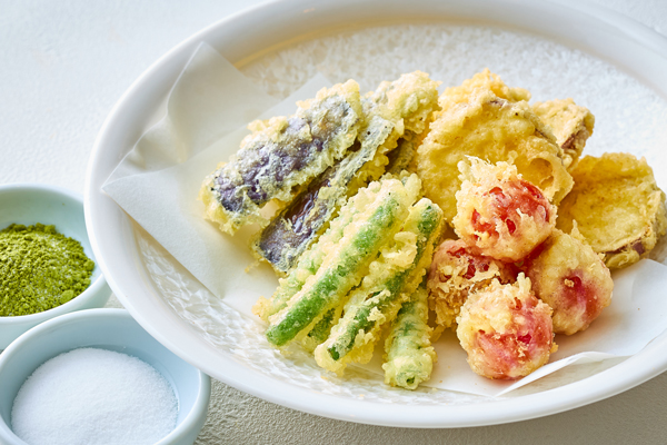日本料理からは、プロならではの「カリッ、サクッ」の食感がご堪能いただける「海老と東京野菜の天麩羅」をご用意いたします。目の前で揚げるパフォーマンスもお楽しみください。