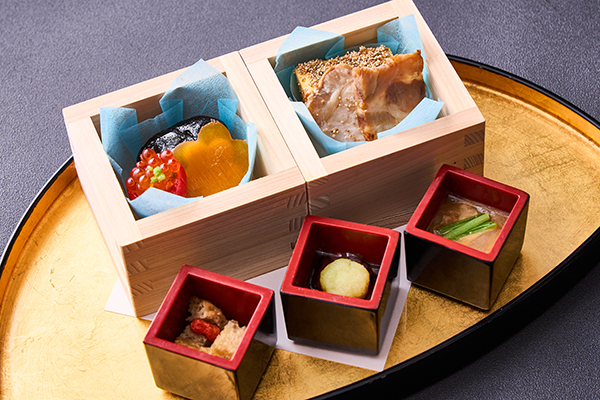 | 桝盛り | 麩の辛子和え 人参カステラ 芋このわた とやまポークの麹焼き 金柑いくら お多福豆 梅花吟醸熨斗梅 ホタルイカ沖漬け 柚子おろし |