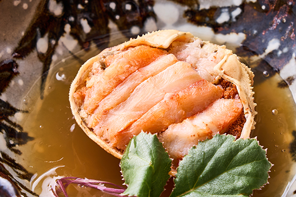 | 先付 | 香箱ガニ甲羅盛り 生姜餡かけ 黒胡麻豆腐 (黒豆 三つ葉 わさび) |