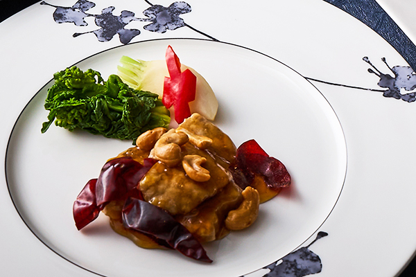 カレー風味の焼き叉焼/季節野菜甘酢漬け/鱈の麻辣醤ソース>