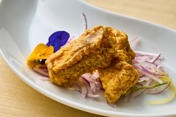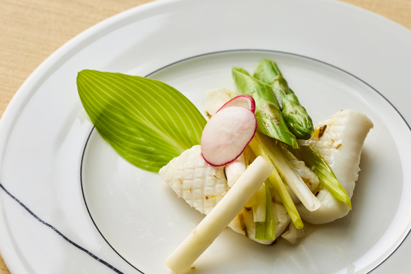 全7品のランチコースは旬の食材である筍が入った前菜盛り合わせにはじまり、蓮根の食感がアクセントになった地鶏団子入りのふかひれスープをお楽しみいただけます。塩味ベースの優しい味わいのスープに、600円プラスするとふかひれ姿煮入りに変更可能です。その他、ディナーコースでも提供するふき味噌のソースを、ランチではいかと季節野菜に合わせました。旬のレタスは、たらこと一緒にミルクで煮込み、食感を楽しめる一品になっています。食事は春を感じるわらびを入れた鯛炒飯と、桂林人気の伝統メニュー四川麻婆豆腐を楽しめる湯麺からお好きなものをお選びください。