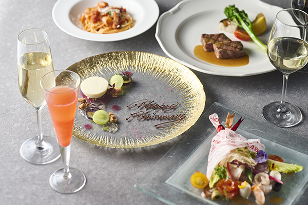 2時間のフリーフローを堪能しながら、花束に見立てたオードブル、パスタ、メインディッシュ、メッセージが入ったアニバーサリーデザートが楽しめる全4品のプランです。記念日やお誕生日などのお祝いに、夜景を楽しみながらゆったりとした時間をお過ごしいただけます。