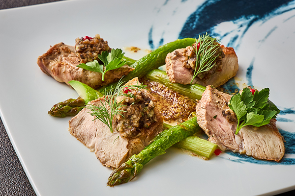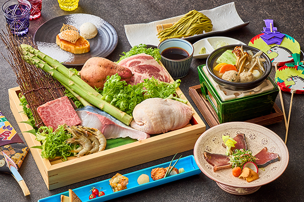 おいしいものの宝庫である鹿児島県の食材を、前菜、造り、小鍋、メイン料理、デザートで使用しました。メイン料理は料理長が厳選した数種類の食材の中からお選びいただけ、炭火焼きや鉄板焼きなど食材に合わせた調理法で仕上げてご提供いたします。