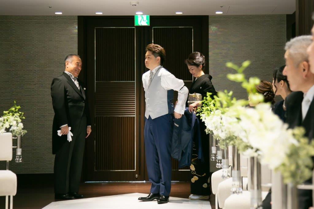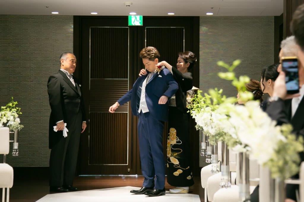 挙式ではご新郎様のお仕度を親御様にお手伝いいただく「ジャケットセレモニー」を、
