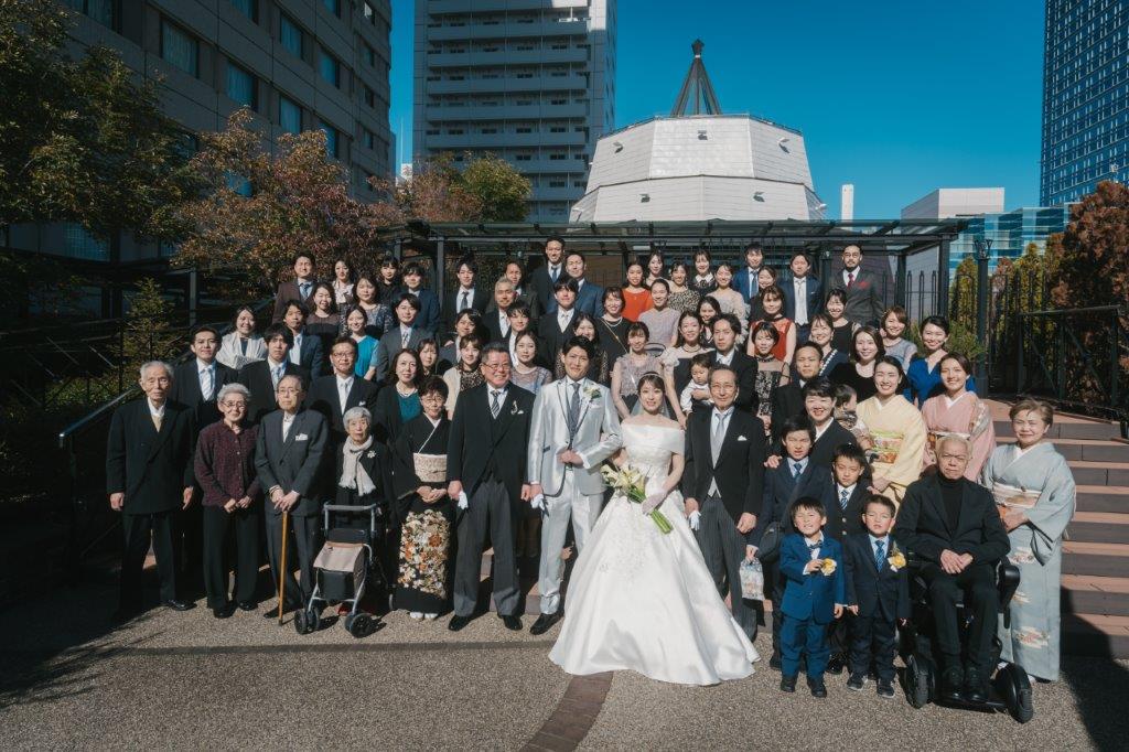 雲ひとつない青空のもと、ゲストの皆様からあたたかな祝福をいただき、笑顔あふれる集合写真を撮影しました